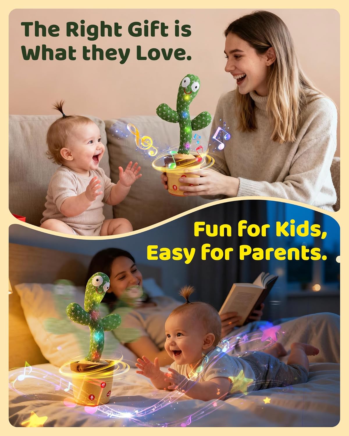 This TWORIVER talking and dancing cactus toy is an interactive musical plush that sings, repeats speech, and wiggles with lights to keep babies and toddlers engaged. It is especially useful for early language, sound exploration, and simple cause‑and‑effect play.​